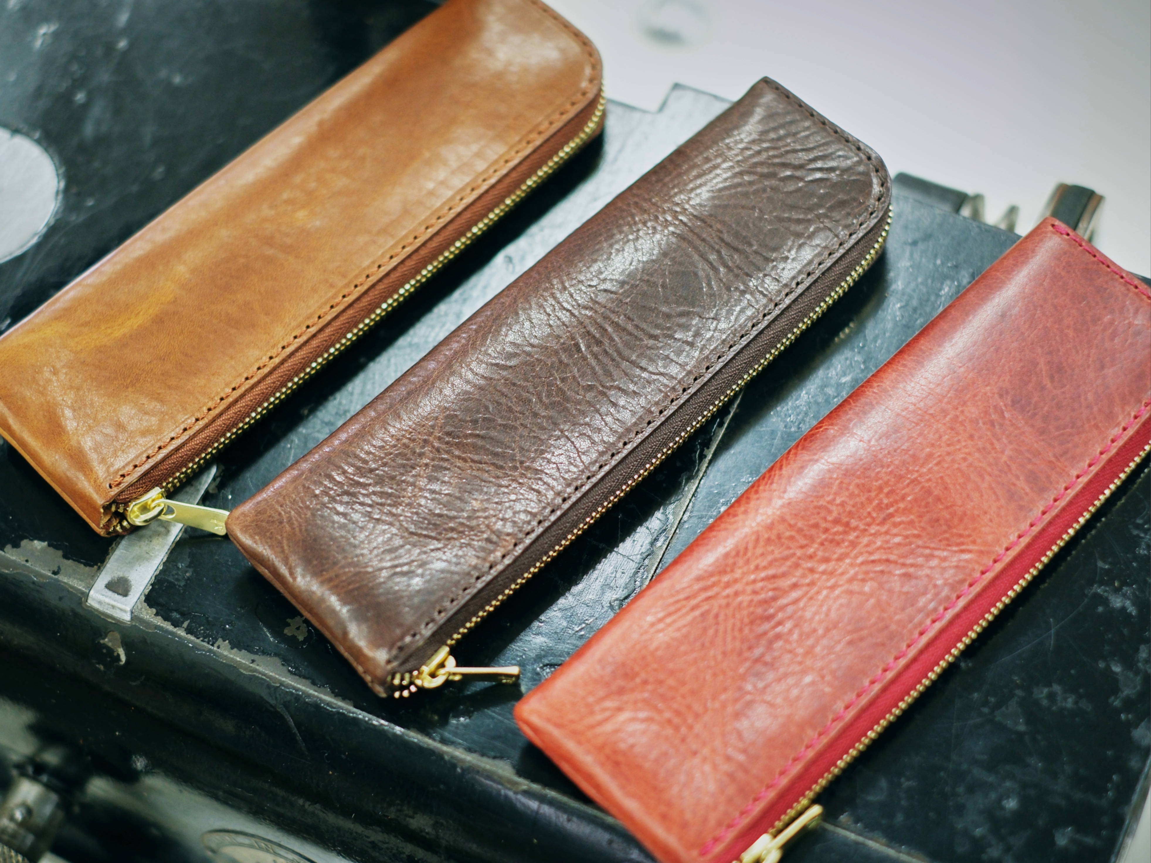 オリジナル文具第一弾として誕生したのが、ビンテージレザーペンケース。「大切な一本を収納できるケース」をコンセプトに、上質さとビジネスシーンでも使いやすいサイズ感を実現しました。